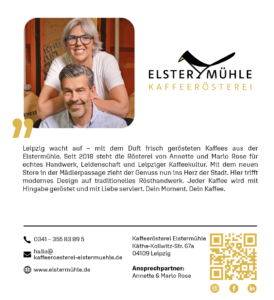 Leipzig wacht auf – mit dem Duft frisch gerösteten Kaffees aus der Elstermühle. Seit 2018 steht die Rösterei von Annette und Mario Rose für echtes Handwerk, Leidenschaft und Leipziger Kaffeekultur. Mit dem neuen Store in der Mädlerpassage zieht der Genuss nun ins Herz der Stadt. Hier trifft modernes Design auf traditionelles Rösthandwerk. Jeder Kaffee wird mit Hingabe geröstet und mit Liebe serviert. Dein Moment. Dein Kaffee.