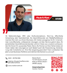Ob Selbstständiger, KMU oder Großunternehmen, Start-Up, öffentliche Verwaltung oder Gastrobetrieb: Als Geschäftskunde von MediaMarktSaturn machen Sie mehr aus Ihrem Business. Wir bieten passgenau für Ihr Unternehmen zukunftsstarke, umfassende Lösungen und den Service gleich dazu. Ihr persönlicher Geschäftskundenberater schnürt Ihnen aus unserem umfassenden Sortiment Ihr passendes Paket. Denn: Als Partner an Ihrer Seite bieten wir Ihnen neben den Lösungen je nach Bedarf auch die Finanzierung, Versicherung oder Installation an. Sind Sie neugierig geworden? Dann entdecken Sie jetzt unser Business-Portfolio und nehmen Sie Kontakt zu uns auf!