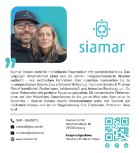 Siamar Reisen steht für individuelle Traumreisen mit persönlicher Note. Das Leipziger Unternehmen plant seit 23 Jahren maßgeschneiderte Urlaube weltweit – von exotischen Fernreisen über luxuriöse Inselwelten bis zu unvergesslichen Safaris. Das erfahrene 18-köpfige Team um Sandra und Michael Riebel kombiniert Fachwissen, Leidenschaft und intensive Beratung, um für jeden Reisenden die perfekte Route zu gestalten. Ob romantische Flitterwochen auf den Malediven oder Abenteuer in Südafrika – Siamar Reisen macht Urlaubsträume wahr, mit Service auf höchstem Niveau und echter Begeisterung fürs Entdecken. Probieren Sie’s aus!