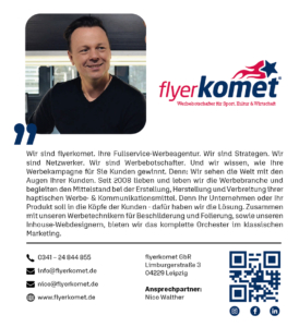 Wir sind flyerkomet. Ihre Fullservice-Werbeagentur. Wir sind Strategen. Wir sind Netzwerker. Wir sind Werbebotschafter. Und wir wissen, wie Ihre Werbekampagne für Sie Kunden gewinnt. Denn: Wir sehen die Welt mit den Augen Ihrer Kunden. Seit 2008 lieben und leben wir die Werbebranche und begleiten den Mittelstand bei der Erstellung, Herstellung und Verbreitung ihrer haptischen Werbe- & Kommunikationsmittel. Denn Ihr Unternehmen oder Ihr Produkt soll in die Köpfe der Kunden – dafür haben wir die Lösung. Zusammen mit unseren Werbetechnikern für Beschilderung und Folierung, sowie unseren Inhouse-Webdesignern, bieten wir das komplette Orchester im klassischen Marketing.